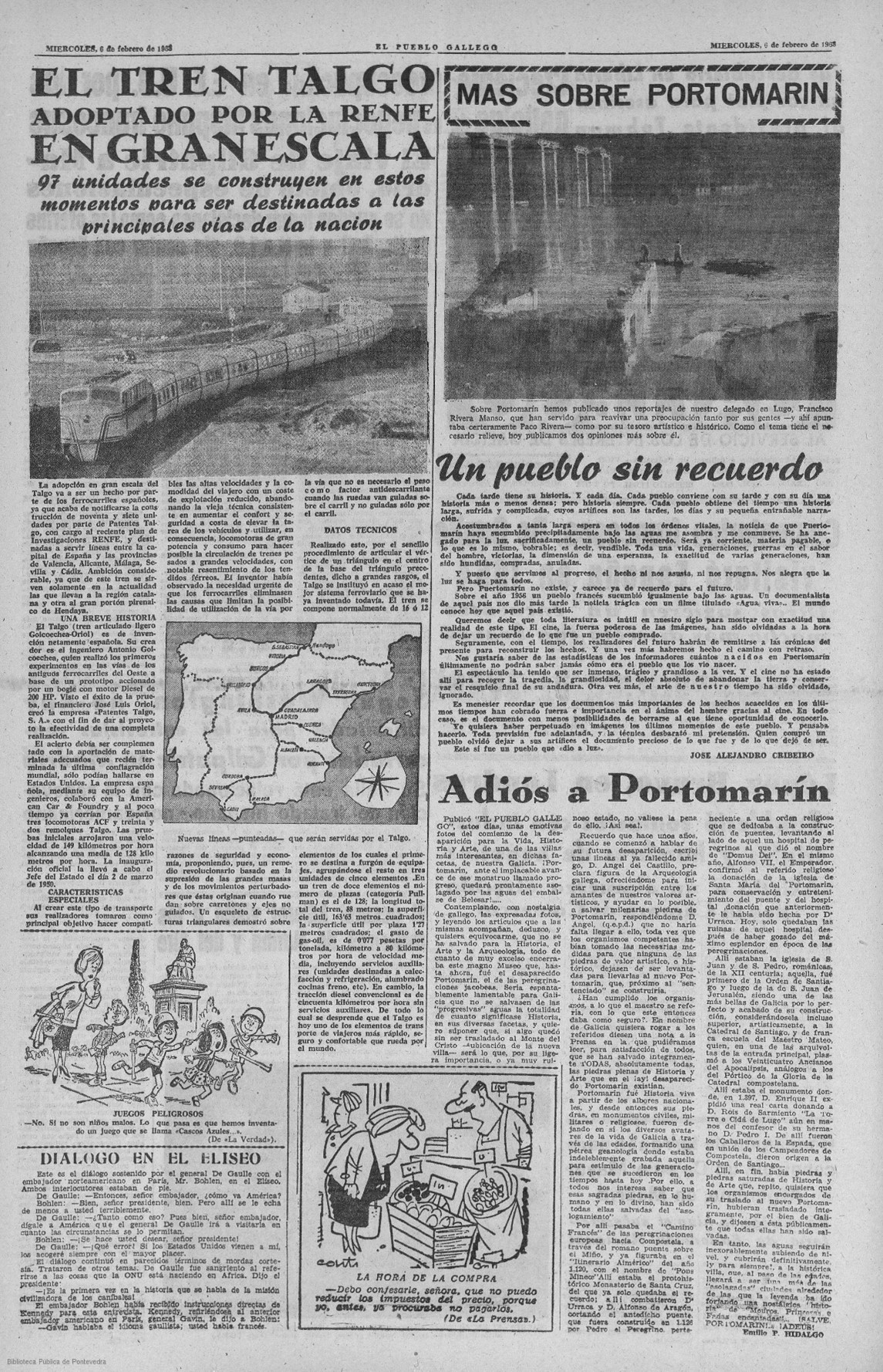 Publicó “EL PUEBLO GALLEGO”, estos días, unas emotivas fotos del comienzo de la desaparición para la Vida, Historia y Arte, de una de las villas más interesantes, en dichas facetas, de nuestra Galicia. ¡Portomarín, ante el implacable avance de ese monstruo llamado progreso, quedará prontamente asolagado [sic] por las aguas del embalse de Belesar!...