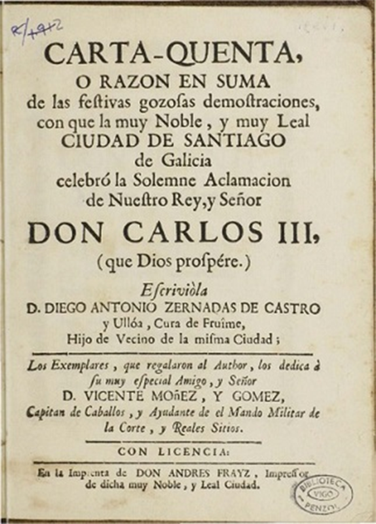 Carta-quenta, o razón en suma de las festivas gozosas demostraciones, con que la muy Noble, y muy Leal Ciudad de Santiago de Galicia celebró la Solemne Aclamacion de Nuestro Rey, y Señor Don Carlos III, (que Dios prospére).